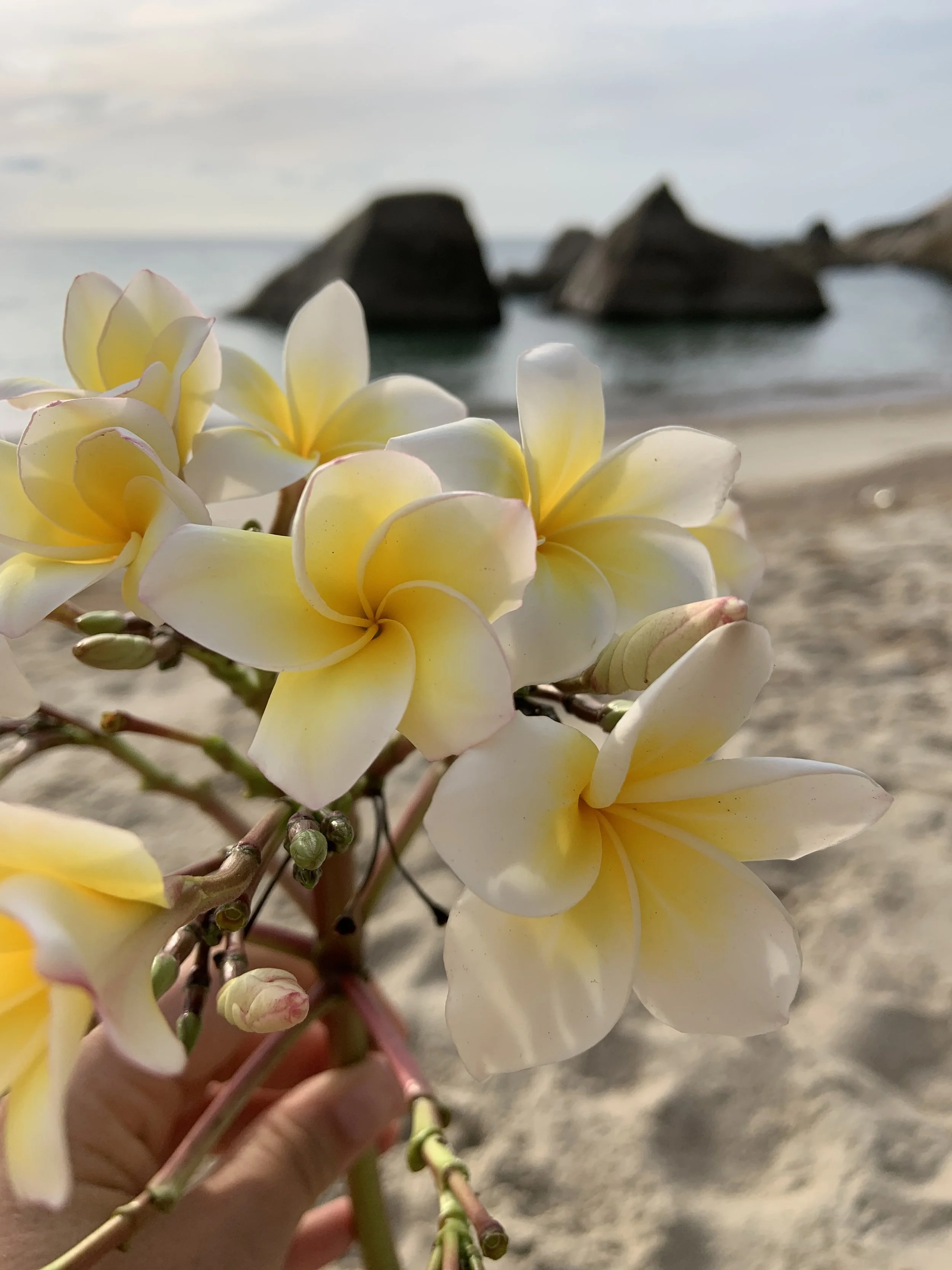 Meine Reise mit den Blumen begann eines Tages am Strand von Koh Phangan, als ich plötzlich das Bedürfnis verspürte, mit Blumen zu meditieren. Meine ersten waren Frangipani, zart, leuchtend und voller stiller Präsenz. Dieses Erlebnis öffnete mir eine neue Art des Zuhörens. Ich begann, bei meiner Lehrerin Sienna Moon zu lernen, einer Aromatherapeutin, die mit Blütenessenzen und Pflanzen aus ihrem eigenen Garten arbeitet. Von dort aus entfaltete sich mein Weg weiter, vom Kreieren eigener Blütenessenzen bis hin zum Mischen von Ölen und Kräuteraufgüssen während meiner Zeit auf Mallorca.